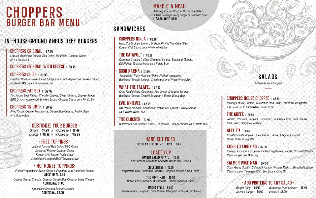 The menu shines with standout creations like the Fatboy, praised for its juicy, perfectly cooked meat and balanced flavors. Customers rave about the well-seasoned patties and delightful sides, such as the crispy fries and impressive onion rings. While some find prices a bit steep, the hearty portions and quality ingredients justify the cost. From classic offerings to vegetarian delights, including the Impossible Burger, Choppers caters to diverse palates.